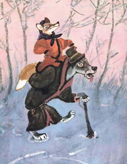 – И то правда, – говорит волк, – где тебе идти. Садись уж на меня – я тебя довезу.