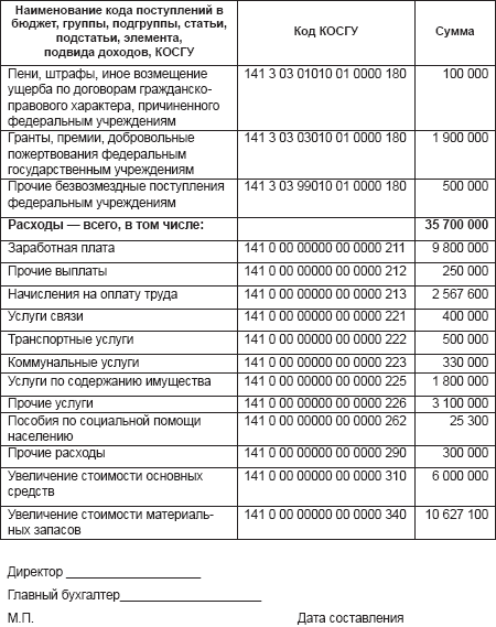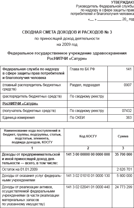 Согласно п. 2 данной Инструкции смета доходов и расходов по приносящей доход деятельности – документ, составляемый учреждением на текущий финансовый год. Порядок ее утверждения устанавливается главным распорядителем средств, им же определяется объем поступлений внебюджетных средств с указанием источников образования и направлений использования этих средств по коду главного распорядителя средств федерального бюджета и коду КОСГУ.