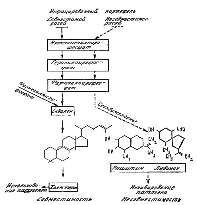 Рис. 8. Биогенез терпеновых соединений в картофеле, инфицированном совместимой и несовместимой расами возбудителя фитофтороза