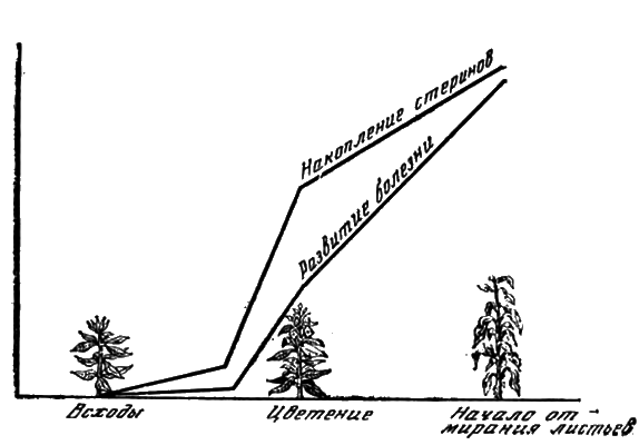 Возбудитель фитофтороза картофеля, согласно теории иммуногенеза М. С. Дунина, относится к болезням нисходящей фазы онтогенеза. Фитофтороз впервые появляется к моменту цветения картофеля и достигает своего максимального развития в конце лета. Недаром эта болезнь называется еще поздней гнилью. Динамика появления и накопления стеринов в листьях точно отражает появление и развитие болезни: содержание стеринов во всходах очень низкое, оно резко возрастает к началу цветения и достигает своего максимума к началу естественного отмирания ботвы (рис. 9). Получается, что слабо функционирующий стериновый биогенез ограничивает развитие гриба на первых этапах вегетации, а возрастание содержания стеринов позволяет ему распространяться и спороносить на более поздних фазах развития растений.