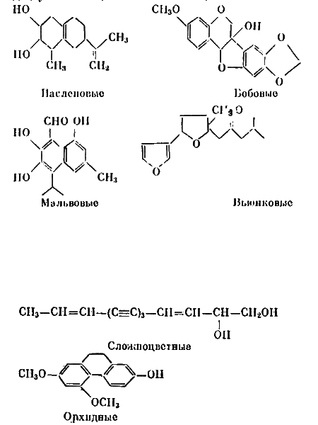 Сюда относятся вещества, различные по химическому строению. Они являются конечными продуктами того измененного обмена веществ, который возникает в растительных тканях в ответ на заражение. А у растений разных таксономических групп происходят разные изменения обмена, в результате чего у разных растений образуются его разные конечные продукты. Например, у пасленовых под влиянием заражения начинают образовываться сесквитерпеноидные вещества, которых раньше в здоровых тканях не было, у бобовых – изофлавоноиды, у сложноцветных – полиацетилены.