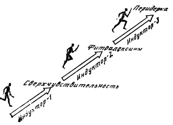 Итак, клетка несовместимого хозяина, распознавшая элиситер проникающего паразита, гибнет в результате реакции СВЧ. Из ее клеточных стенок высвобождается олигосахарин, несущий весть об опасности в глубь ткани, заставляющий ее мобилизоваться для борьбы с врагом (одним словом, иммунологический буревестник). Налицо своеобразная эстафета индуцирования (рис. 10). Гибнущая клетка передает своим здоровым собратьям сигнал «SOS».