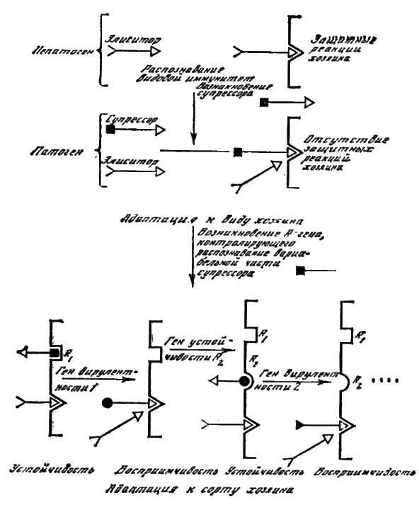 В ходе сопряженной эволюции с паразитом у растения появляются гены сортовой устойчивости (или R-гены). Предполагается, что их продуктом является некое вещество, или рецептор, у растения, которое связывает супрессор по его вариабельной группировке и тем самым как бы «уводит» его с поверхности взаимодействия паразита и хозяина, оставляя элиситер вне конкуренции. Не имеющий более конкурентов элиситер вновь вступает во взаимодействие с рецептором, индуцируя у пего защитные реакции. Такое растение приобретает сортовую устойчивость к патогену, основанную на наличии у него R-гена.