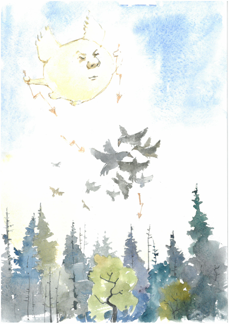 Над непроходимой чащей в чудовищном фиолетовом вихре закружилась очумевшая стая птиц. Чёрным клубком, задевая кроны деревьев, прокатилась под сгустком облаков зловещая масса, теряя на ходу смоляные перья. Сородичи с ожесточением клевали самую мелкую ворону. В драке бедняжка почти полностью потеряла хвост. Птицы-преследователи больше походили не на семью, а на банду, где не щадили ни своих, ни чужих. На фоне Солнца, сильно раскалившегося от возмущения, образовалась растущая как на дрожжах круглая тень, которая с каждой секундой всё больше и больше становилась похожей на хлебный дух великого поэта и путешественника Колобка. Яркая вспышка света и страшный гром быстро распутали птичий клубок. Шаровая молния расколола воздушную массу на две части. Всё видимое над землёй пространство стало чёрно-белым. Пернатых накрыло ударной волной.