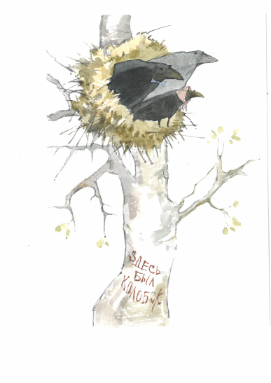 Когда беглянка скрылась за горизонтом, чёрная стая перелетела в рощу. Сторожевые птицы сели на высокую берёзу, покрытую охровой листвой. На охраняемой бересте корявыми буквами было нацарапано: «Здесь был Колобок». Пичуги, проводники между мирами живых и мёртвых хлебных человечков, ржаных и пшеничных духов, возмущённо загалдели, закаркали. В Ягодном лесу под корягами, пнями, деревьями или кустами – всюду прятались загадки. Семейство врановых берегло главную заповедную тайну – тайну жизни и смерти Колобка.
