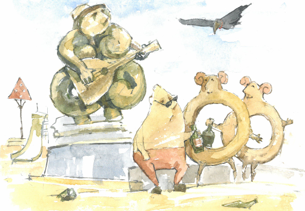 – Горе-то какое! – тихо произнесла ворона. – А памятник-то на Жамка похож, только ещё более пожёванный, – заметила «садовая голова», разглядывая причудливую скульптуру. – Как будто его все дикие звери в нашем Ягодном лесу по очереди жевали-жевали, а потом выплёвывали… Этот памятник, наверное, называется… – ворона призадумалась. – Горе… горе… горельеф! Удивительный город Опара! Чего здесь только нет!