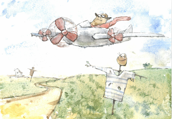 «Садовая голова» парила над столицей, размышляя о сложной жизни и попутно любуясь архитектурой. На Загородном проспекте ей приглянулась библиотека, старинное здание с лепниной в виде колосков. На краю города квадратным пятном, на фоне картофельных огородиков, в окружении пугал, выделялся аэропорт. Над вороной мягко шёл на посадку хлеболёт, возможно, из соседнего города Тортищева, а может быть, с Дарницкого курорта, морского города, куда впадает быстрая и могучая Молочная река. За штурвалом летательного средства сидел авиатор Рулет.