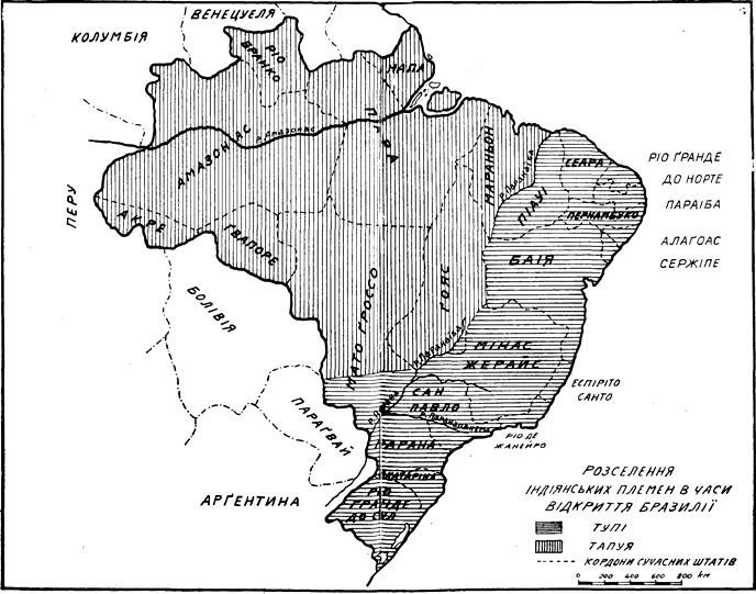 – Дивіться, сеньор Іван: оце – мапа Бразилії. Тут іде ріка Північна Паранаіба, далі ріка Південна Паранаіба, ріка Парана і ось оця смужка на південь. Отже, на схід від цього кордону, на побережжі Атлянтійського океану, жили індіяни племени тупі. На захід – тапуя. Винятком з того є племена ґварані, які трохи порушують цей виразно визначений кордон і живуть на захід від ріки Парана в тому місці, де вона протікає поміж кордонами провінцій Парана і Мато Ґроссо. Ґваранці також належать до тупісів і становлять серед них найчисленнішу групу. Цих дві основних індійських «нації» – тупі і тапуя поділяються на племена – «трібос», а племена – на роди.