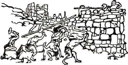 Случилось так, что постройка стены, продвигаясь вперед, достигла места, где из скалы бил родничок. Избыток воды, промыв себе русло, бежал отчаянной рэчонкой, плясавшей по камушкам и кружившейся вокруг обломков скалы. Сперва все обрадовались, пили пригоршнями, досыта, обливали друг друга водой, стекавшей по телу каплями, который блестели на солнце пятью цветами, ослепительно сверкающими.