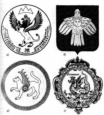 Заслуживает упоминания и герб города Казани. Как сообщает Д. Хафизов (1999), еще в языческие времена в легендах казанских татар (вернее, волжских булгар) существовал добрый дракон-оберег Зилант. Он выступал в роли домашнего духа, охраняющего кров, под которым поселился, заботился о благополучии семьи хозяина дома и защищал его имущество. В 1730 г., когда Казань уже оказалась в составе Российской империи, Зилант стал официальным гербом Казани и вошел в гербы других городов бывшего Казанского ханства, но при этом его облик был сильно искажен и принижен русскими художниками. Сам Хафизов описывает Зиланта как полиморфное существо, наделенное следующими чертами: «...рога оленя (сайгака, лося), глаза зайца, голова волка (собаки, лошади, верблюда), крылья птицы (орла), тело и лапы барса (тигра), когти орла, хвост змеи». А между тем, на казанском гербе мы видим существо с птичьими лапами и крыльями летучей мыши (рис. 20, г), которое похоже на злобного, убивающего взглядом василиска.
