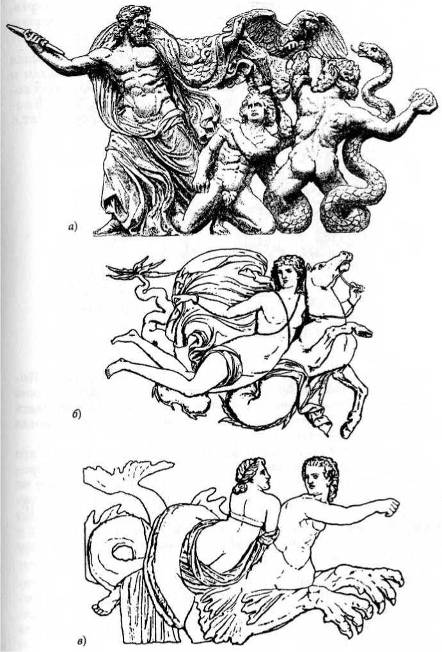 а – борьба Зевса с гигантами (фриз Пергамского алтаря); б – гиппокамп и нереида (глиптотека в Мюнхене) (из: Петискус, 1913); в – тритон (стенная живопись в Стабии)