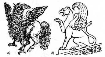 Грифоны. Их изображения встречаются на ассирийских барельефах, относящихся к V тысячелетию до н. э., в Древнем Египте и Северном Причерноморье. Они упоминаются в древнегреческой мифологии, откуда попали в Рим и Западную Европу. Это гигантские львы с головой и крыльями орла (рис. 22, б), которые стерегут золото в стране гипербореев. Упоминаются Г. и в «Заветных песнях птицы Гамаюн» и в СБ. Они являются постоянным орнаментом женских украшений (браслетов и колтов) в Древней Руси. Считалось, что Г. может поднять и унести в своих когтях лошадь с всадником, пару волов или кита. Во время своего пребывания в Персии Александр Македонский поднялся в небо на колеснице, запряженной Г. В существование Г. верили вплоть до XVI в. Некоторые богословы трактовали Г. как эмблему Христа: «Христос есть лев, ибо он царит и обладает могуществом; он орел, ибо после воскресенья возносится на небо» (Борхес, Инт.; Беляев, 1997; МС-1; ВЖ). По мнению Рыбакова (1987), зверино-птичья сущность Г. выражает идею слияния неба и земли (птица символизирует небесную стихию, а зверь – земную).