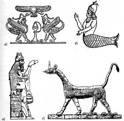 Рис. 23. Ассирийские мифозои: а – люди-скорпионы; б – Дагон; в – Эа; г – Мушхуш (Сиррух) (а и в из: Липин, Белов, 1956; б из: МБ)