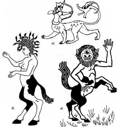 Рис. 24. Химеры, родственные кентаврам: а – восточный кентавр-стрелец (Грузия, XII в.); б – Горгония; в – кентавроциклоп (6 и в рисовал Дик)