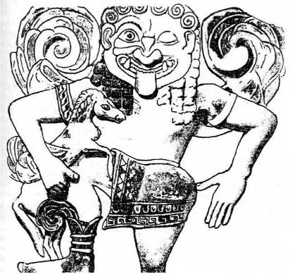 Более убедительна точка зрения Б. А. Рыбакова (1987), который полагает, что Медуза проникла в русские степи из Греции в образе Горгонии, голова которой, отрубленная Александром Македонским, изображена на змеевиках. На некоторых змеевиках угадываются очертания человеческого тела (рис. 26, в) – это изображение змееногой богини, от союза которой с Гераклом, согласно легенде, произошли скифы.