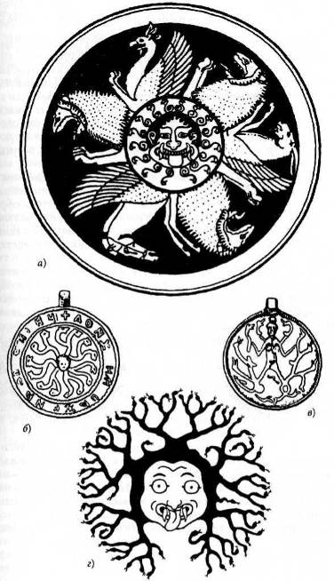 а – щит Афины, украшенный головой Медузы; б и в – змеевики-обереги (из: Демин, 2001); г – Дендрофиоцефал (рисовал Дик)
