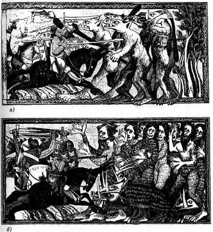 Рис. 27. Иллюстрации к походу Александра Македонского: а – встреча с звероголовыми людьми; б—встреча с шестирукими людьми (ХШ в.; из: «Вселенная и человечество», Ш т.)