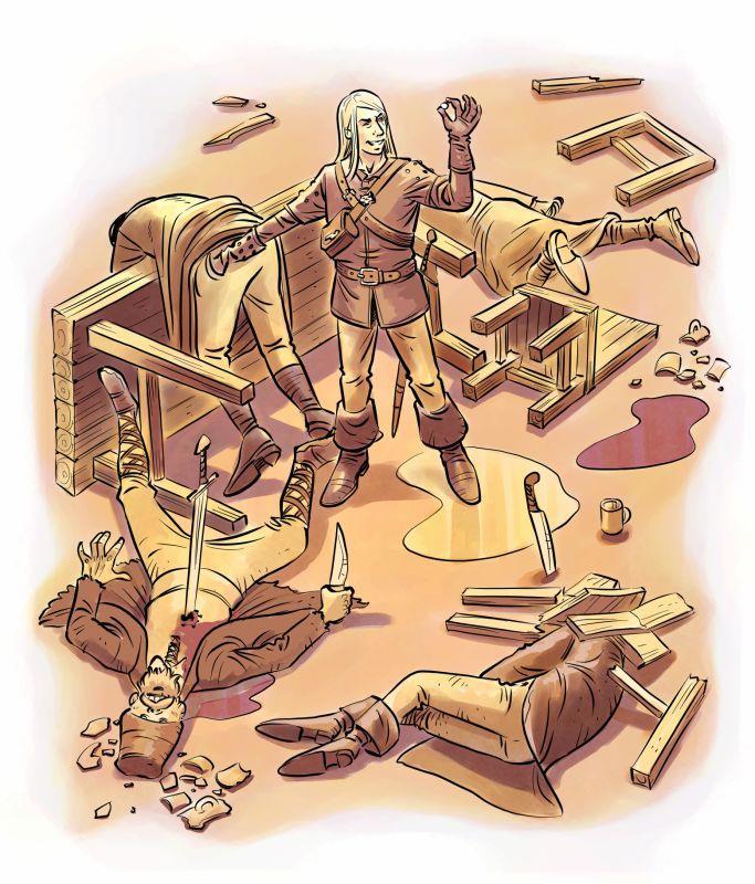 Судя по корчмарю и старосте, вылезающими из-под столов, беловолосый пришел в корчму раньше разбойников и уж точно не заодно.