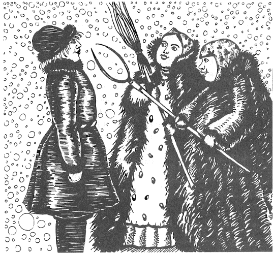 Жених слезает с телеги. В эту минуту ему навстречу в вывороченных шубах с устрашающими жестами, с рогачами, с кольями в руках выскакивают все женщины (родня невесты) и не пускают «разлучника» войти в сени. В конце концов дружка поит женщин вином, и они расступаются, чтобы дать проход жениху.