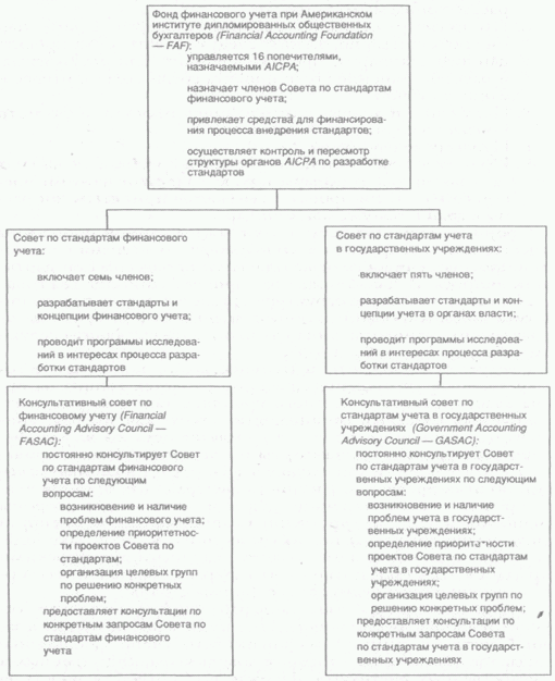 В 30-е гг. AICPA создал в своей структуре специальное подразделение по разработке стандартов учета, ориентированное главным образом на запросы SEC– Комитета по процедуре учета (Committee on Accounting Procedure – CAP). Именно эта структура положила начало процессу разработки стандартов учета на регулярной основе. В конце 50-х гг. она была реструктурирована и переименована, получив название Совета по принципам учета (Accounting Principles Board – АРВ). Наконец, в начале 70-х гг. эта структура приобрела свое нынешнее название и форму – в ходе ее очередной реорганизации был образован Совет по стандартам финансового учета (Financial Accounting Standards Board– FASB). Совет на постоянной основе продолжает разработку стандартов финансового учета под пристальным наблюдением Комиссии по ценным бумагам и обмену. Окончательное утверждение стандартов и придание им силы закона осуществляются Конгрессом, который, однако, в значительной мере полагается на SEC как на государственный орган контроля, за разработкой стандартов. Непосредственная же работа по их созданию ведется профессиональным сообществом, представленным FASB. Для контроля за деятельностью данного совета и привлечения средств, для ее финансирования в структуре AICPA был образован Фонд финансового учета (Financial Accounting Foundation – FAF).