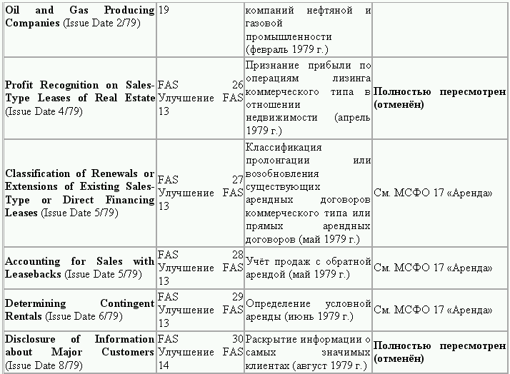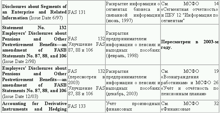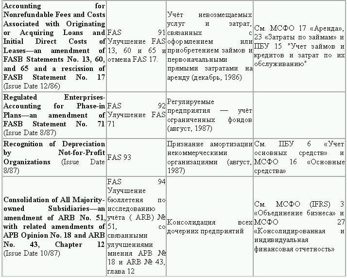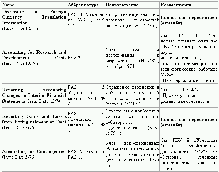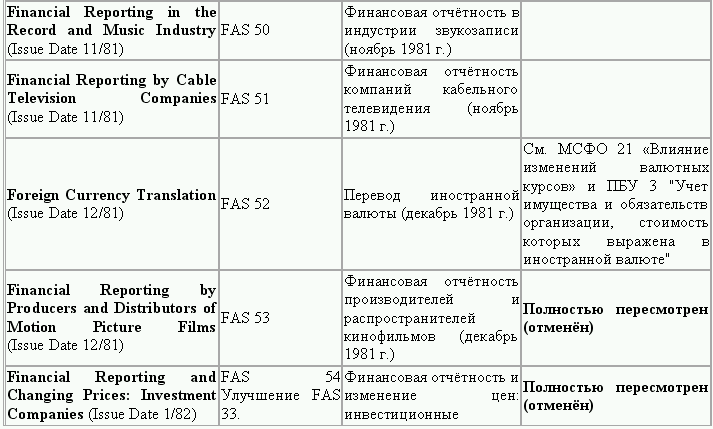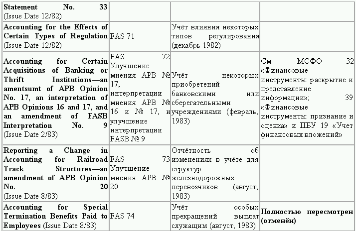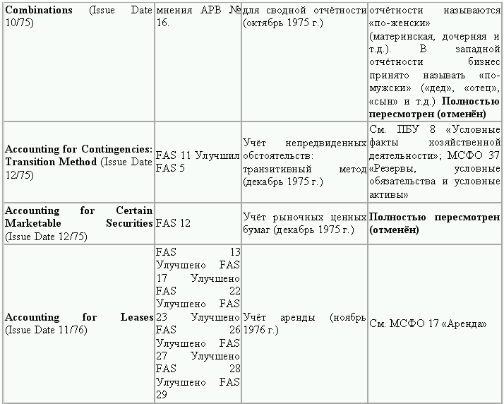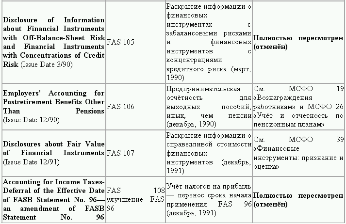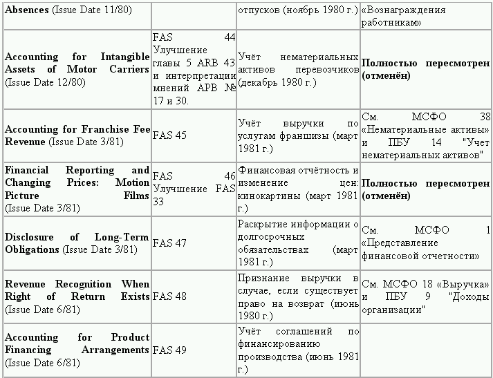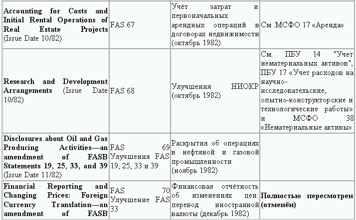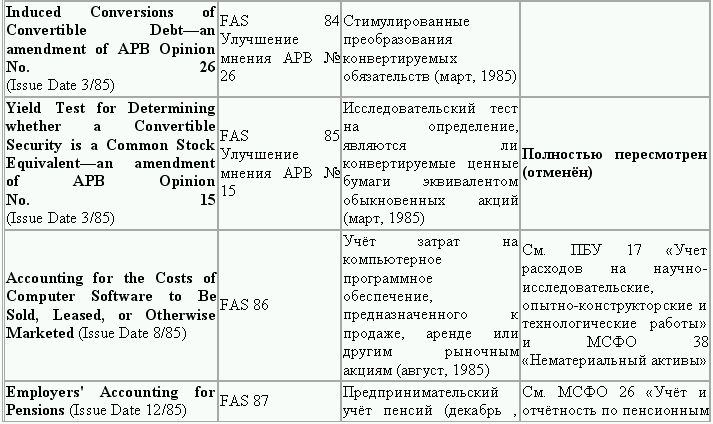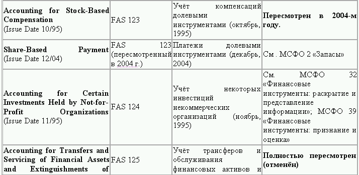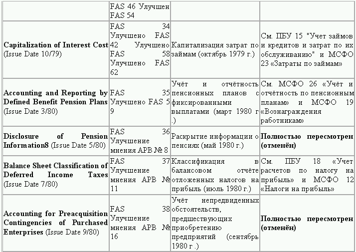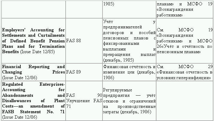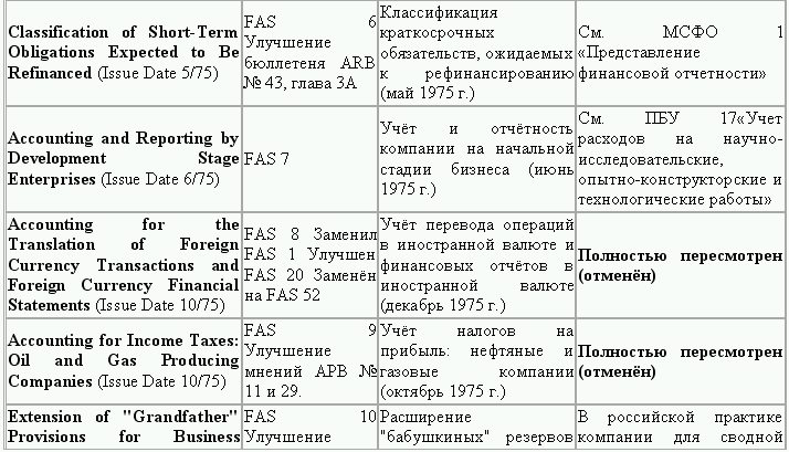 С момента своего образования в 1973 г. Совет по стандартам финансового учета выпустил свыше 100 положений о стандартах финансового учета и шесть Положений о концепциях учета. Из их числа лишь около 10 % связано с решением новых проблем финансового учета и столько же – с решением проблем, специфичных для той или иной конкретной отрасли. Остальные же 80 % приходятся на пересмотр ранее принятых стандартов.