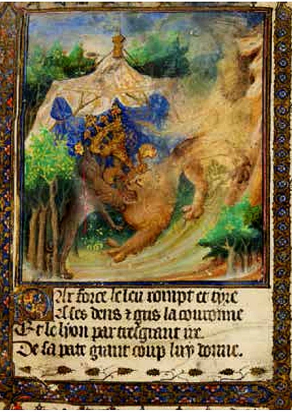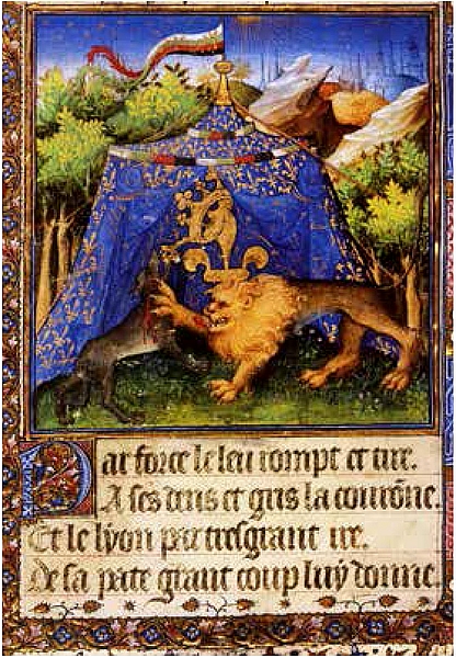 Что же касается познаний самого герцога в различных видах колдовства, то о них сообщал не только текст «Оправдания». Та же идея подчеркивалась в дошедших до нас парадных копиях трактата при помощи миниатюры, расположенной в начале обеих рукописей. На ней в аллегорической форме была изображена последняя схватка Жана Бесстрашного и Людовика Орлеанского: на волка, пытающегося стащить корону с французской лилии, нападал лев, наносящий ему смертельный удар лапой (ил. 1, 2)[23]23