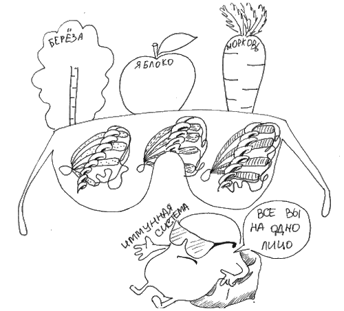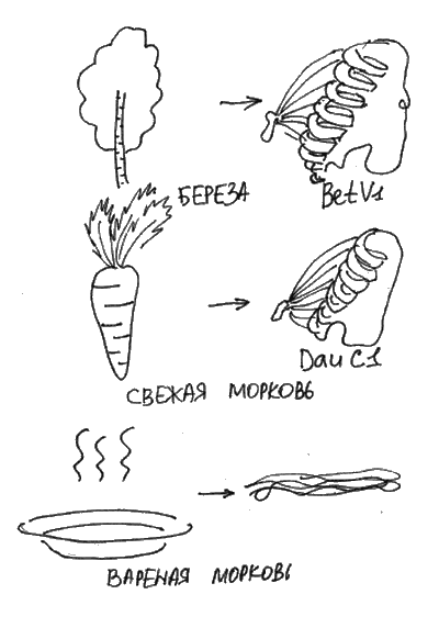 Но не все так просто. Оказалось, что некоторые белки похожи между собой, поэтому иммуноглобулины Е, образовавшиеся к одному из них, могут прикрепляться к другим белкам с «похожей внешностью». Вследствие этого феномена у некоторых людей может развиваться перекрестная аллергия. Например, у человека с аллергией на березу может развиваться перекрестная аллергия на яблоки, морковь или сельдерей (рис. 6).