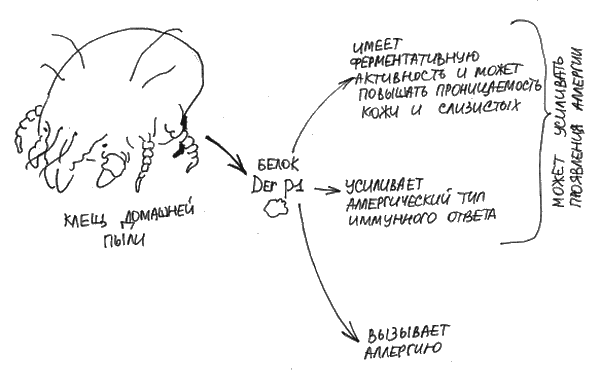 При изучении свойства аллергенов было обнаружено, что в некоторых случаях они имеют особенные свойства, влияющие на течение аллергии. Например, аллергены клещей домашней пыли обладают способностью повреждать слизистые оболочки дыхательных путей и делать их более проницаемыми, причем не только для клещевых аллергенов, но и других белков. В течение жизни человека спектр белков, вызывающих у него аллергию, может расширяться. Происходит это в том числе потому, что повышенная проницаемость слизистых оболочек дыхательных путей приводит к проникновению чужеродных белков туда, где их быть не должно. Клетки иммунной системы аллергика, обнаружив чужеродную молекулу, могут неправильно распознавать ее, считая врагом, и сражаться с ней. Некоторые аллергены умеют усиливать аллергический тип иммунного ответа, например, мажорный белок клещей домашней пыли DerP1. Он не только вызывает симптомы у большинства людей с аллергией на пыль, но и взаимодействует с клетками слизистых оболочек дыхательных путей, в результате чего они выбрасывают вещества, стимулирующие аллергический тип иммунного ответа. (рис. 10). [188]