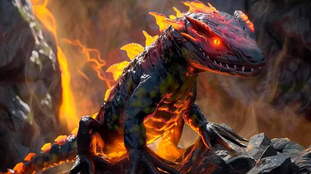 Внезапно раздался протяжный вой, от которого кровь стынет в жилах. Мы резко обернулись и увидели в отдалении здоровенную огненную ящерицу, значительно больше прежних. Она бежала прямо на нас, оставляя за собой шлейф искр. Ее чешуя переливалась, как раскаленные угли.