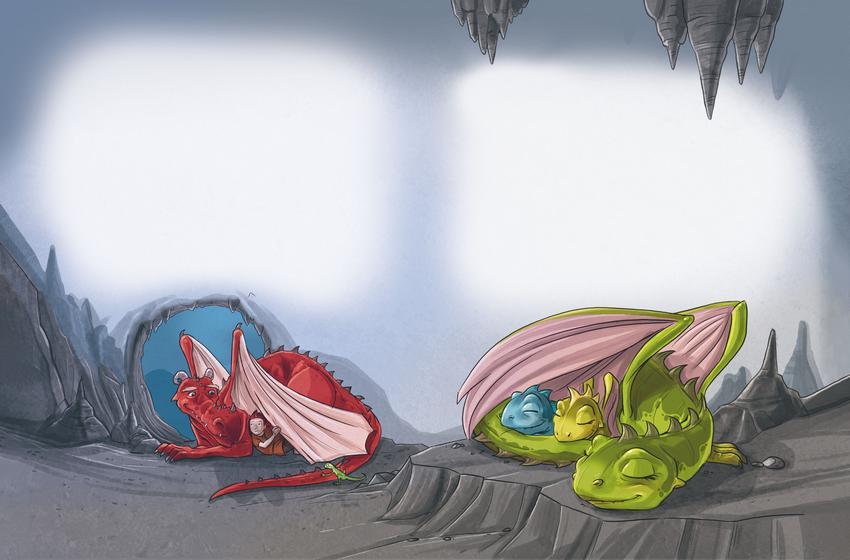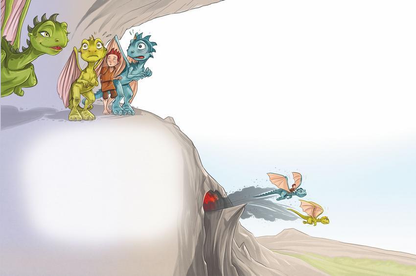 Пока Диндра глубоко вздыхала, дракончики уже удрали из пещеры. Пых даже разрешил Вико взобраться к себе на спину.