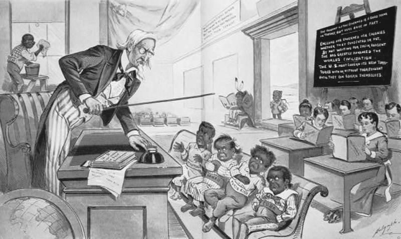 Сатира на зарождающийся американский империализм и жестокость американцев по отношению к жителям заморских стран. На этой карикатуре из выпуска сатирического иллюстрированного журнала Puck, вышедшего в свет в январе 1899 года, Филиппины, Пуэрто-Рико и Куба изображены в виде детишек, которых поучает дядя Сэм. Дети, сидящие на задних партах, читают книги, на обложках которых можно разглядеть названия американских штатов. В дальнем углу комнаты изображен маленький индеец, который держит книгу вверх ногами, а на пороге «открытых дверей» стоит китайчонок. В верхнем левом углу – афроамериканец, который моет, как обычно, окно в классе. На доске написано: «В теории согласие подданных – дело хорошее, но в жизни оно встречается редко. Англия правит своими колониями независимо от их согласия. Не дожидаясь их согласия, она продвинула мировую цивилизацию далеко вперед. США должны править своими новыми территориями независимо от того, согласны ли на это их жители, пока те не научатся управлять собой самостоятельно».