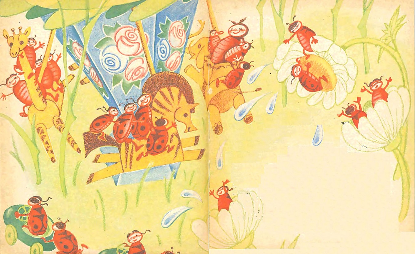 Прежде всего, на площадке возвышалась карусель со скамеечками для сидения, вокруг карусели были расставлены подскакивающие повозочки, крутящиеся бочки, качающиеся лодочки. Сразу двадцать букашек вскочили на карусели, а двадцать других начали её крутить.