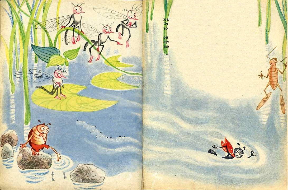 Но когда пришли к озеру, вся его бодрость и желание купаться вдруг исчезли. Хвастунишка никак не мог отважиться влезть в воду. Прыгая по берегу, он по очереди окунал в воду то одну, то другую ногу. Зато Ферда смело разбежался по стебельку камышинки, сделал в воздухе тройное сальто и окунулся в воду, да так мастерски, что никто не заметил никаких брызг.