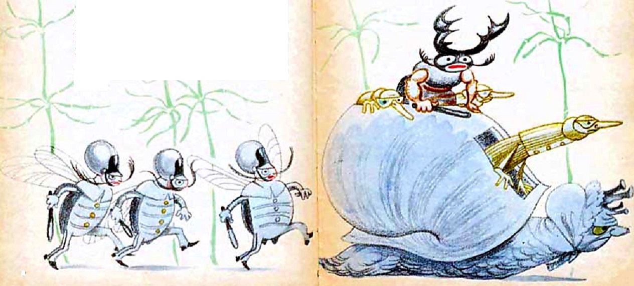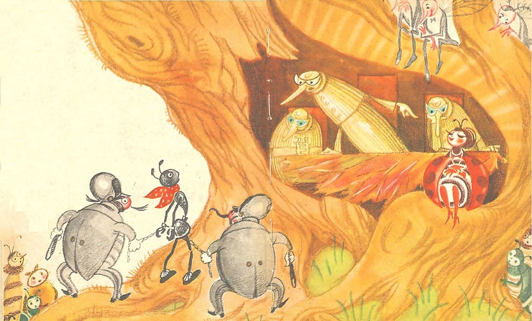 В дупле за столом сидели судьи – три жука-долгоносика, в углу стояли смущённые комары, вызванные в суд в качестве свидетелей. Около общественного обвинителя трибунала вертелась пышно одетая божья коровка. На суд была вызвана и улитка, но она не была так красноречива, как Берушка, и, кроме того, не смогла бы войти в двери дупла со своим домом-ракушкой, поэтому отсутствовала.