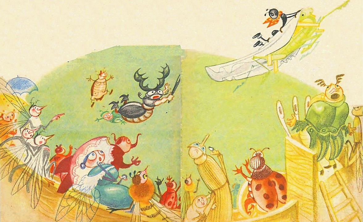 Возле божьей коровки сидела вонючка, которая с перепугу упала и выпустила свою вонючую струю прямо в лицо Берушки. Берушку под руки подхватили два комара и потащили к реке, чтобы смыть вонючую жидкость. Она кричит, что не хочет купаться… Разные жучки, сидевшие на трибунах внизу, шумят, требуют, чтобы им вернули деньги, которые они заплатили за билеты…