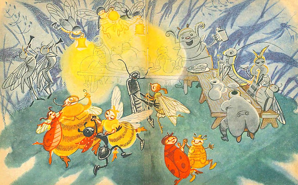 Раздались звуки музыки, и пары закружились в танце. Ферда танцевал с пчелой, сверчок пригласил симпатичную мушку, а ремесленники и шмели пошли в пляс с красными букашками. Те стыдились всё больше и больше, но танцевали с азартом.