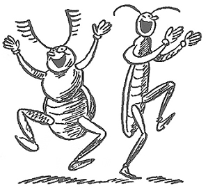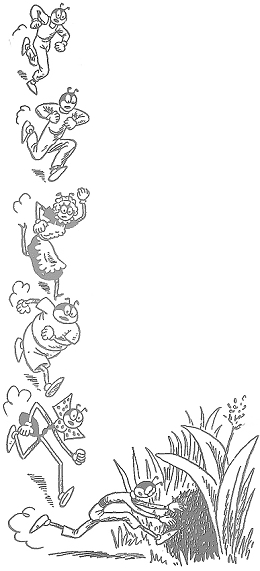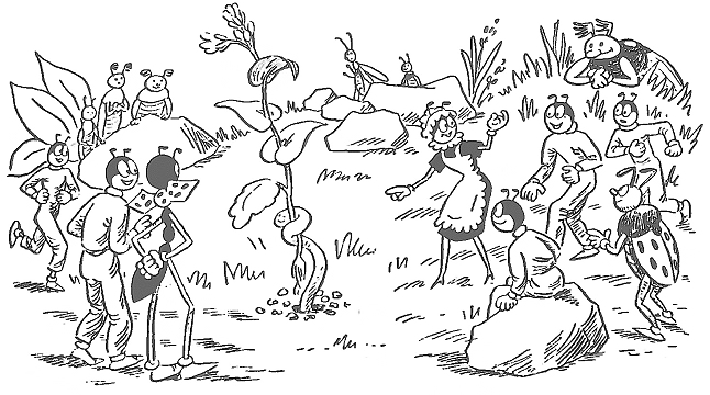 Только он вышел наверх, как вдруг из травы выскочил маленький, смешной Жучок и начал перед ним кувыркаться, ходить на руках, танцевать и смешно кланяться.