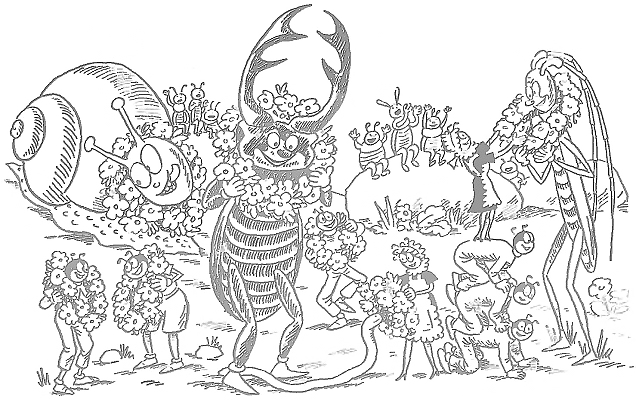 Затем муравьи наградили венками Улитку, Рогача, Дровосека и маленькую Жижалочку, – они ведь так помогли! Ах, как они обрадовались! Как были горды! Правда, маленькая Жижалочка от смущения вся покраснела, а Улитка, пока никто не видел, съела из венка все молоденькие листочки. Дровосек же надел венок на шею и полетел показать его своей жене.