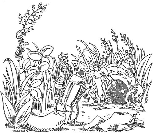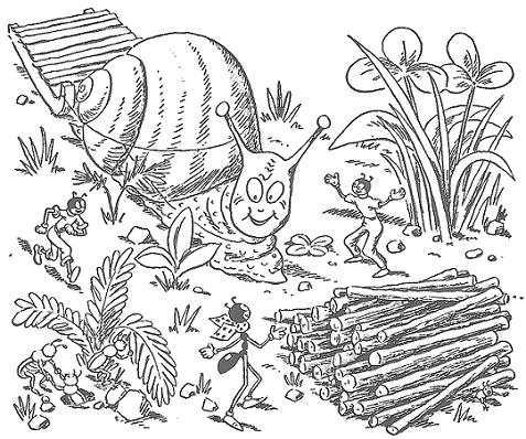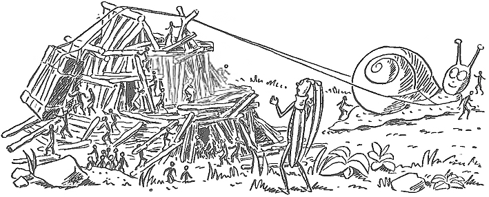 – Осторожнее! – закричали ему. – Сейчас мы испробуем наше изобретение! – За муравейником послышалась команда: «Взяли! Взяли!». Там ползла Улитка; на неё были накинуты толстые верёвки. Они тянулись через весь муравейник и, кто бы мог подумать, поднимали на другой стороне сразу большой кусок стены.