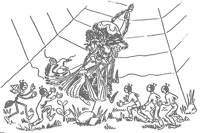 Один за другим падали парашютисты в паутину. Пауки стремительно набрасывались на них и крепко связывали каждого пленника. Они хватали всё новых и новых Карапузиков, пожирателей яичек.