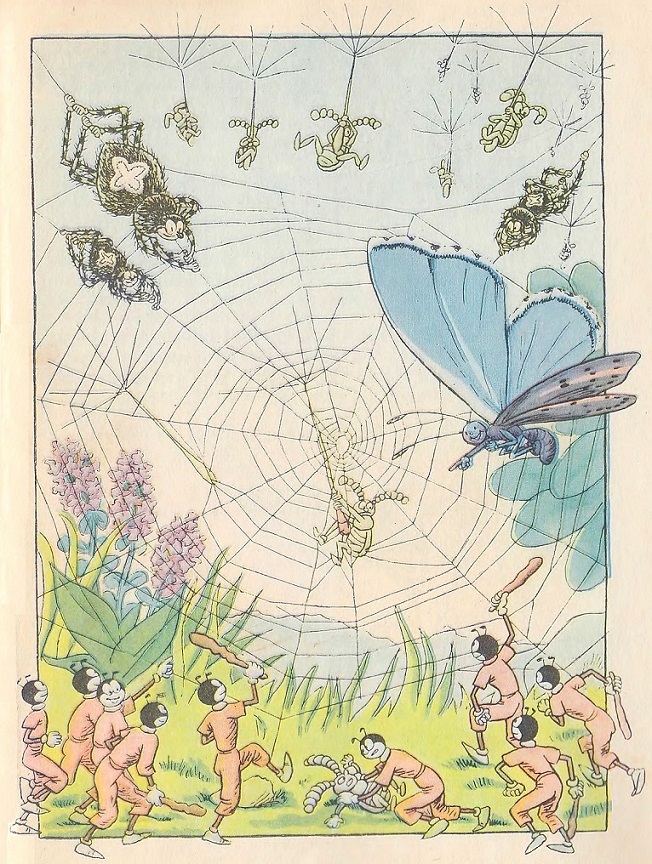 Но что это? Пленник кричит: «Ферда, Ферда, помоги, это я, Шмель!» Бедный Шмель! Как это он попался? Скорей к нему, пока не поздно. Хотя он большой и сильный, а один бы пропал! Пауки его так опутали верёвками, что через минутку ему бы пальцем не пошевелить!