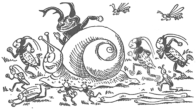 Муравьям казалось, что колонна движется очень медленно, и они от нетерпенья стали выбегать из рядов. Они шмыгали у Улитки под самым носом. Улитка испугалась, что кого-нибудь раздавит, и закричала: