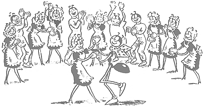 А Паук решил повсюду натянуть верёвки, чтобы никто не смог ни выйти, ни войти в муравейник. Но что поделаешь, если Ферда сам захотел вернуться домой!.. На прощанье муравьи устроили большое торжество и приготовили великолепное и богатое угощение. Нянечки, бывшие рабыни, приготовили такие блюда, какие когда-то готовили лишь для королевы Отрокаров, а после ужина пришлось Ферде протанцевать со всеми нянечками по очереди.