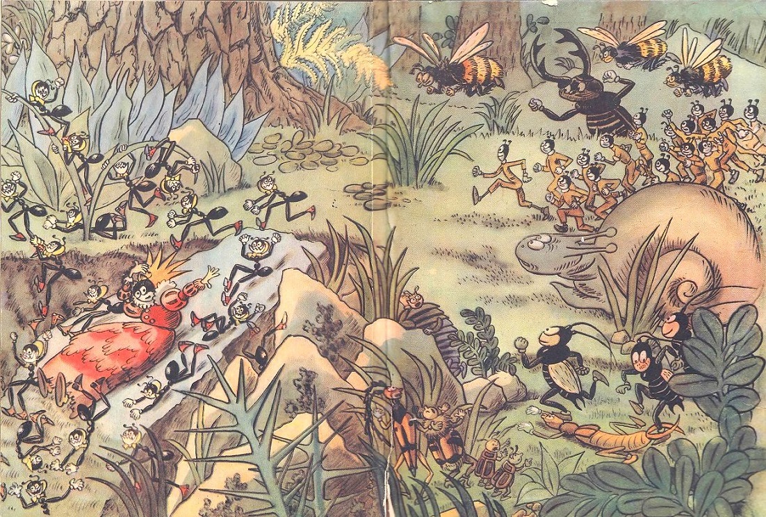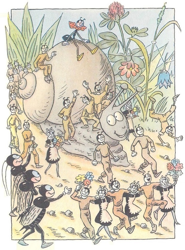 Ах, если бы увидеть то, что делалось впереди! Колонна муравьёв катилась могучей лавиной, около неё с одной стороны шли Рогач и Улитка, с другой кузнечики и целые толпы зевак.
