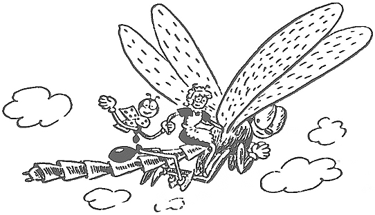 Что было делать Ферде? Так и не удалось ему попрощаться со всеми! Он пересел с Улитки на Стрекозу, и Стрекоза – фью-и-и-ть! – полетела, как реактивный самолёт, к его родному муравейнику, где так безутешно плакали червячки.