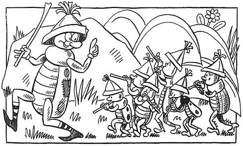 Опять громко застрекотали кузнечики. Сколько было новостей! Кузнечики даже сложили целую песню; и теперь, если где-нибудь стрекотал кузнечик, то он стрекотал только о позорном бегстве Отрокаров. Он стрекотал о походе мирных муравьёв; он стрекотал об Улитке, о Рогаче, о Жижалах, он стрекотал и о муравье с красным в белый горошек платочком на шее.