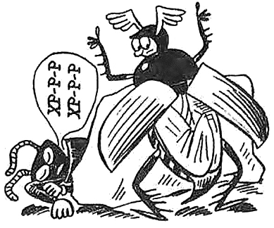 Знаете, дети, я бы на месте Пытлика не стал связываться с Хрущаком. Жук Хрущак, конечно, добрая душа, да и его дети, мучные черви, тоже – а иначе стали бы они себя отдавать на съедение птицам в клетке, но сердить или будить днём Хрущака не стоит.