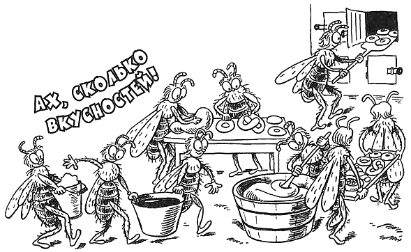 Этого, конечно, Пытлик не знал, никогда такого не слышал. Тогда пчёлы разрешили Пытлику на следующий день зайти на кухню, посмотреть, как пекут сласти. Ах, сколько тут было вкусностей! Одни пчёлы притащили кадушку чистого мёда, другие сыпали в него ведёрками пыльцу, третьи замешивали тесто, а четвёртые лепили из теста рогалики, бублики, булочки и бисквиты, и всё это пеклось для пчелиных личинок.