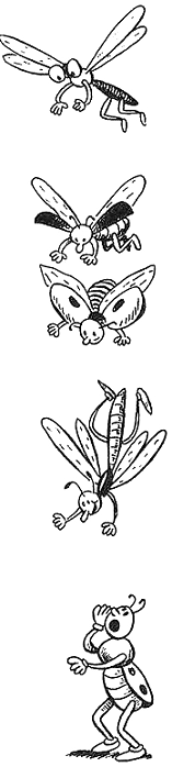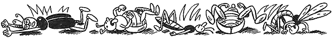 В конце концов все четверо повалились на спину и застонали от усталости, вокруг них валялись остальные букашки, которые от каждого «пы-пы-пы» мчались прятаться, и изнурённые кузнечики, которые при каждом «пр-пр-пр» замирали прямо посреди прыжка.