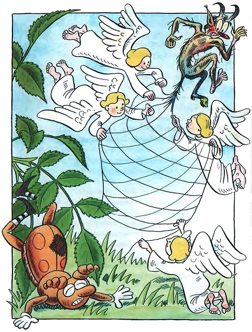 В глазах у него потемнело, а потом как будто даже посветлело, и со всех сторон слетелись ангелы. Они стали ткать для Пытлика паутину, вытягивая нити из чёртова хвоста. Потом из чёрта фейерверком посыпались искры, и тут уж Пытлик окончательно потерял сознание. Он был в глубоком обмороке.